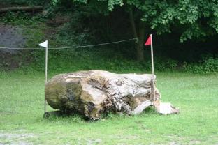 Der 1. Gutspark: Der alte Gutspark ist das Herzstück der Geländestrecke. Hier finden sich inzwischen die meisten Hindernisse. An den Trainingstagen ist dieser Bereich immer geöffnet. Er bietet eine Reihe von einfachen Hindernissen zum Einstieg oder Trainingsbeginn, u.a. eine kurze Baumreihe als in-out-Folge. Dieser Teil ist ganzjährig, auch im Winter zu bereiten. An den das Herz des Parks bildenden Teich schließt sich südlich der sogenannte „Wasserdurchritt“ an, ein mit dem Teich direkt durch einen Graben verbundener Wasserbereich. Er bietet die Möglichkeit zum einfachen Durchreiten von Wasserstellen, kann aber auch über einen kleinen Absatz oder einen Baum eingesprungen werden. Der Baum auf der Nordseite ist zum Aussprung oder Einsprung geeignet und liegt auf A/L-Niveau. Der Verbindungsgraben bietet zwei offene Übersprungmöglichkeiten auf E- und A-Niveau. Quer zum Einritt befindet sich ein kleiner Tiefsprung mit Coffin-Effekt. Am Stutenstall liegt ein weiterer, kleinerer Wasserbereich mit Hindernissen bis L-Niveau. Der Weg um den Teich schließt eine etwa 1000 m lange, rennbahnähnliche Galoppstrecke, die über Park, Wiesenbereich und Springplatz bis zur Friedhofsweide führt. Hier kann das Galopptraining auch nach Zeit durchgeführt werden. Die Strecke lässt sich ohne oder mit Hindernissen reiten. |